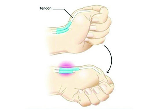 微博上曾热传这张“智能手机中毒测试图”,像配图中那样握拳后,手向下,你是否感觉图中所示蓝色部分很痛呢?如果是,你很可能患上了“狭窄性腱鞘炎”。其发病与人们过度使用键盘、鼠标、智能手机导致肌腱过度摩擦有关。经常用大拇指玩智能手机的人,其手部肌肉长时间保持快速、紧张的运动,易导致手指、腕部关节过度劳损和手部肌肉痉挛。而长期的肌腱运动会导致腱鞘变厚,引起骨性纤维鞘管狭窄,继而肌腱被过度磨损而发生炎性反应,从而产生疼痛感。