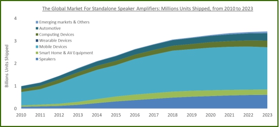 智能手机和其他音频播放设备中采用立体声音频的趋势表明,音频放大器在智能手机设计中扮演着尤为重要的角色。因此,音频放大器在容量和技术两方面都出现了大幅增长(见下图1)。根据SAR Insight&Consulting音频功率放大器市场增长报告1 :“与2010年相比,2018年音频放大器的市场出货量增长了3倍,这不仅因为音频播放设备出货量的增加,而且每台设备的通道数量也在增加。”报告还指出,立体声喇叭已广泛应用于售价超过550美元的高端智能手机市场,特别是自2016年iPhone®7移动数字设备立体声的推出以来。从那时起,许多其他旗舰智能手机也在其产品中采用了立体声喇叭。该分析公司还预计,立体声将扩展到定价在200美元至500美元间的中端手机,估计2018年有近6亿个放大器用于中端市场,到2023年预计将增加到近7亿个。
